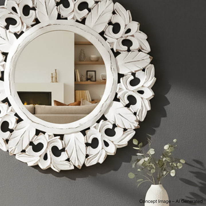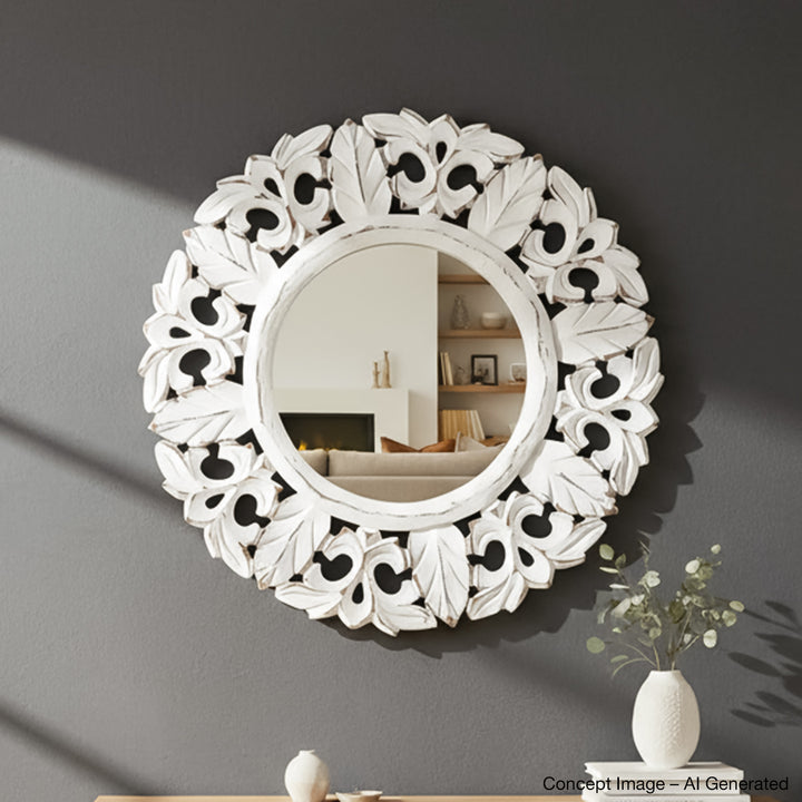 Celebrate the beauty of handicrafts in your decor, with our vintage collection of floral mirrors. Inspired by tunes of nature, featuring delicate carved detailing on premium wood that adds eloquence of an earthen look to your walls - these mirrors, look like timeless artworks hanging in your space. Covered in white paint, the accent blends seamlessly with all wall colors and home decor designs.
