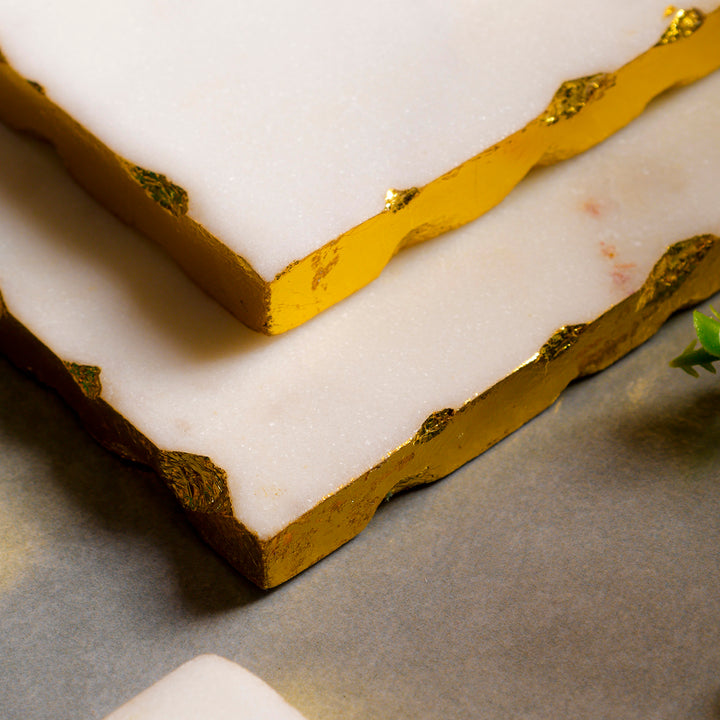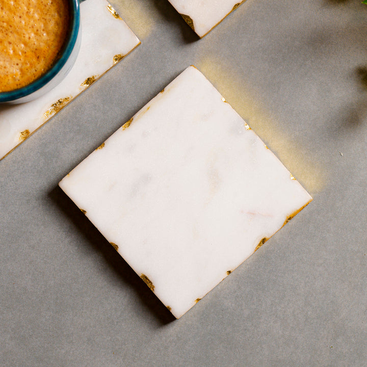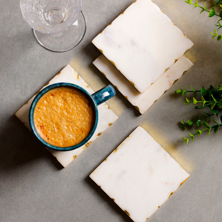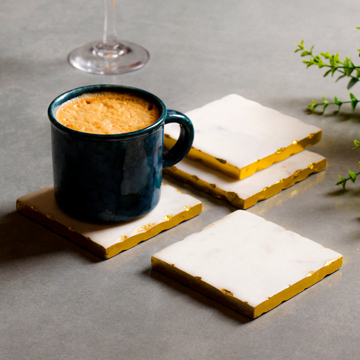 Casa Decor White Marble Square Coaster Set with Gold Edges
