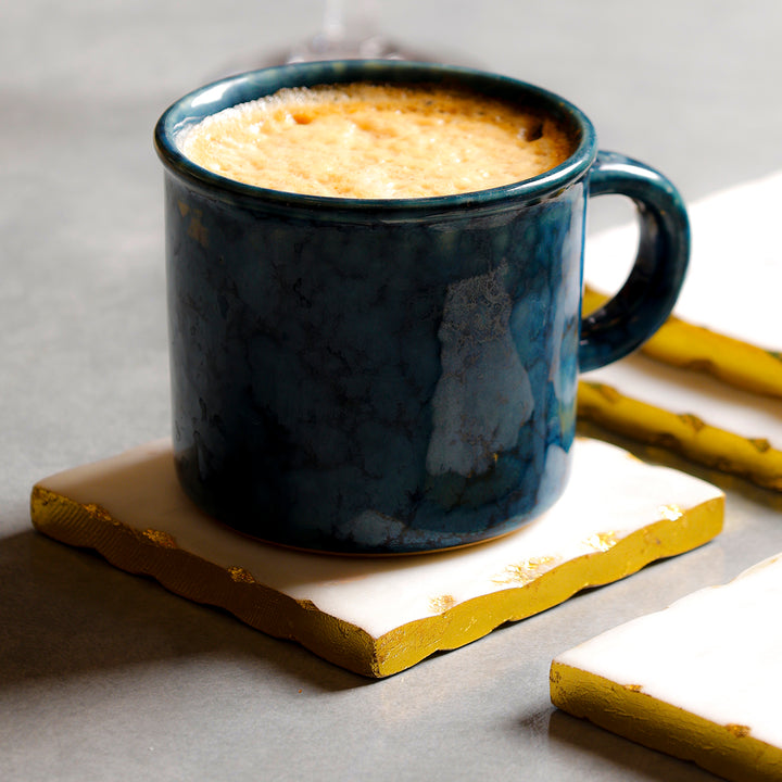 Handcrafted square white marble coasters with metallic gold edges elevate any table. Solid stone is heat-resistant, moisture-safe, and protects surfaces from stains and scratches. Heavy, non-slip and easy to wipe clean. Perfect drink coasters for coffee tables, dining and office desks; housewarming and festive gift.