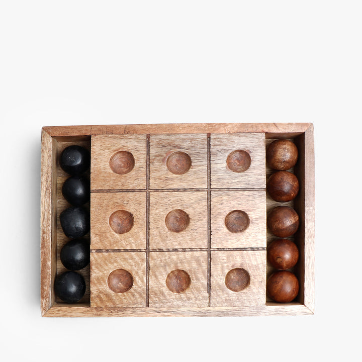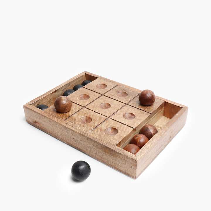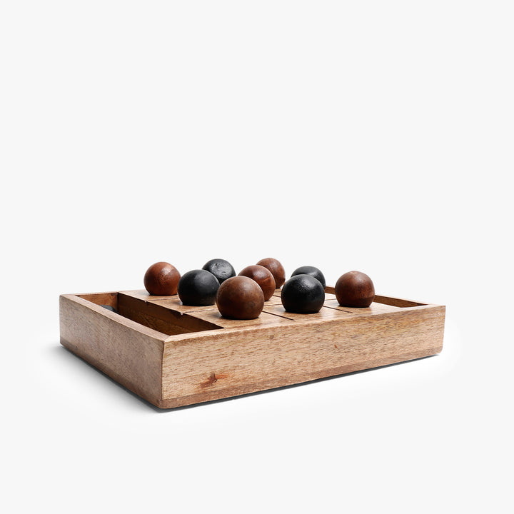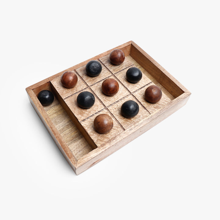 This interactive home decor piece offers a unique twist on the classic game of Tic-Tac-Toe. Instead of the traditional X's and O's, it comes with round balls colored in two different shades. Designed with functionality in mind, the game board features small openings on both sides. This allows you to conveniently store the balls when the game is not in use, ensuring that you don't lose a single piece.