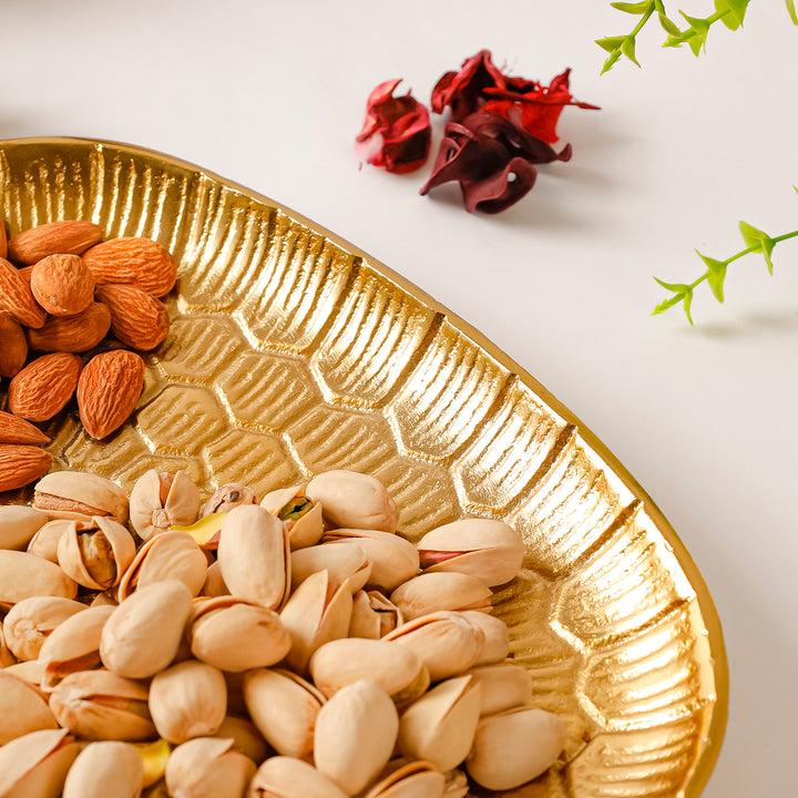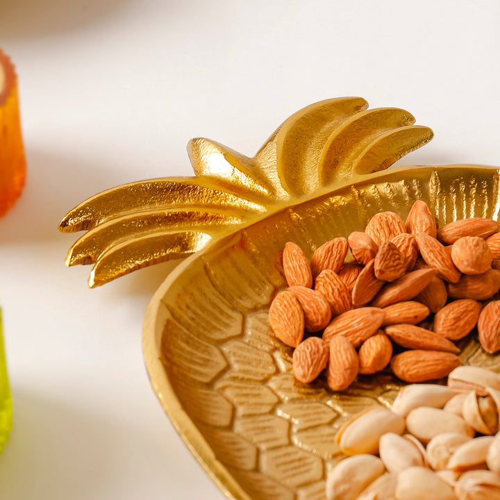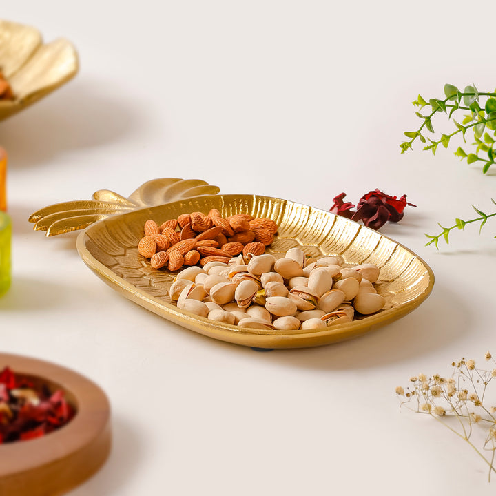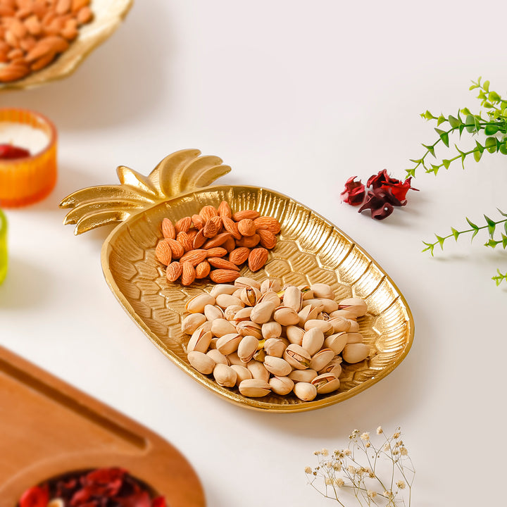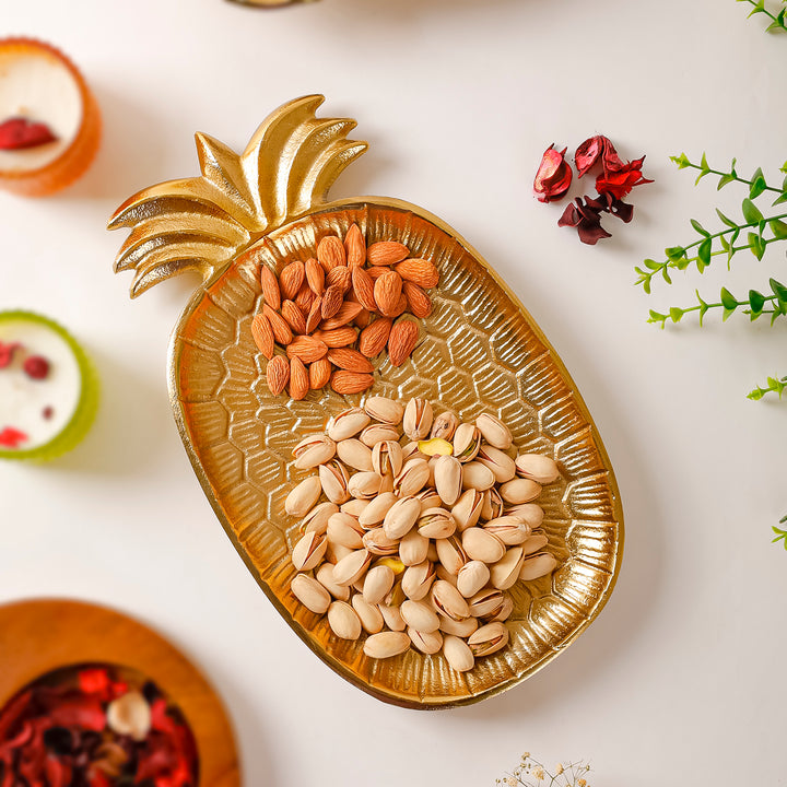 Handcrafted pineapple-shaped aluminum tray with gold finish for nuts, sweets, fruits and candies. Durable, food-safe coating, tarnish-resistant and easy to clean. Perfect decorative tray for coffee table, dining table, console or pooja setup. Stylish gift for housewarming, Diwali, festive home decor and table styling accent.