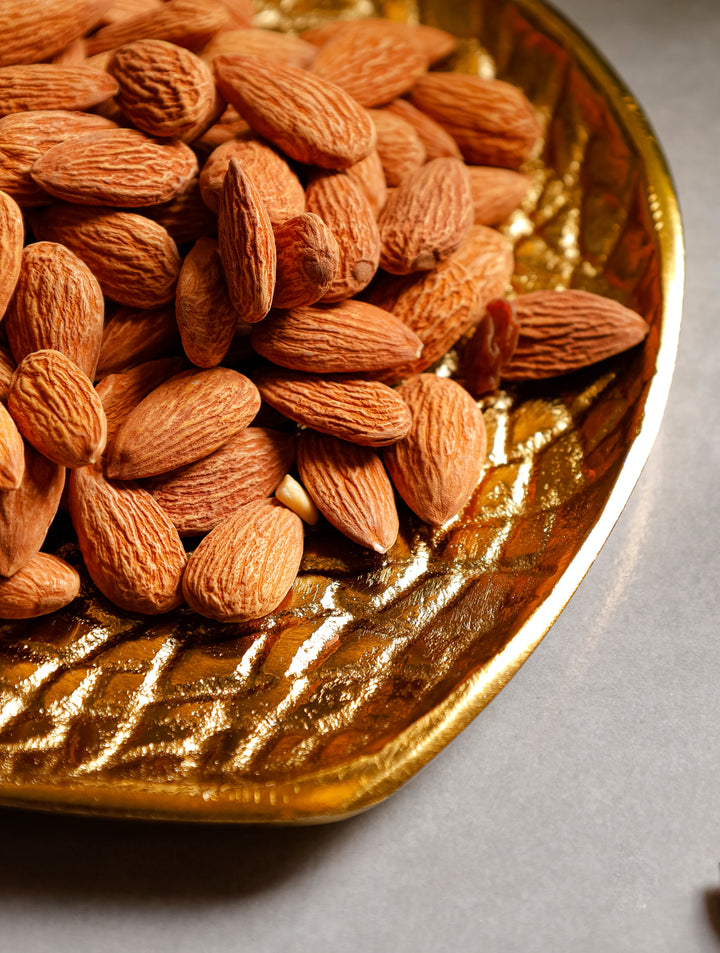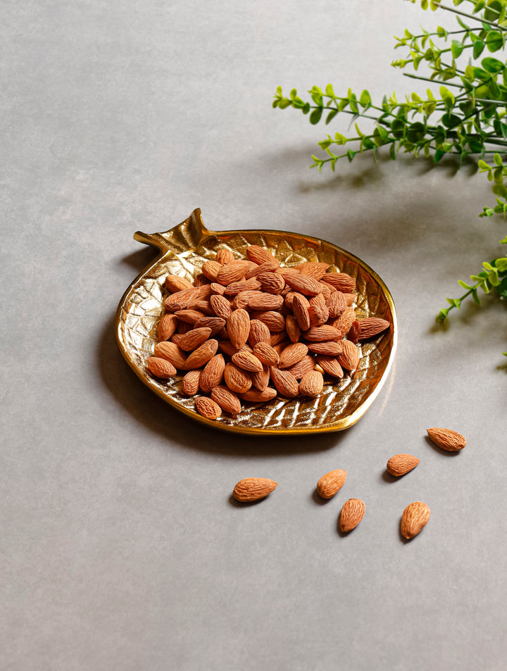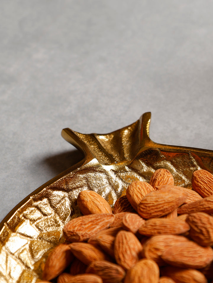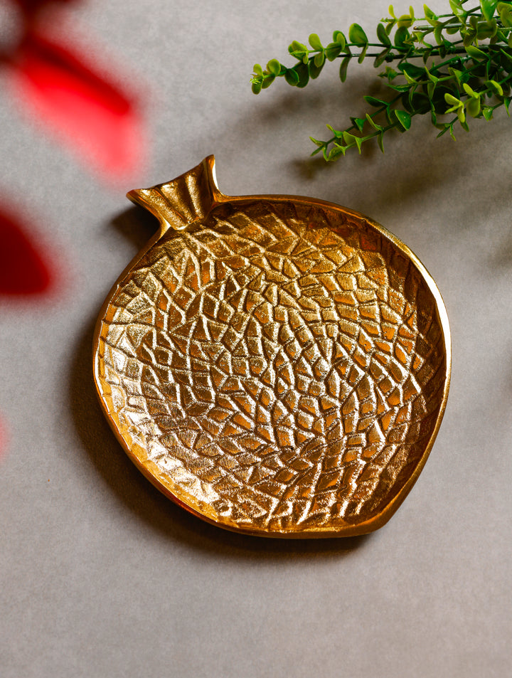 Handcrafted pomegranate tray in premium aluminum with a rich gold finish. Textured interior, sturdy rim, and smooth base. Tarnish-resistant and easy to clean. Serve dry fruits, sweets, or use as a decorative bowl, jewelry holder, or entry key tray—perfect festive gift and elegant table decor.