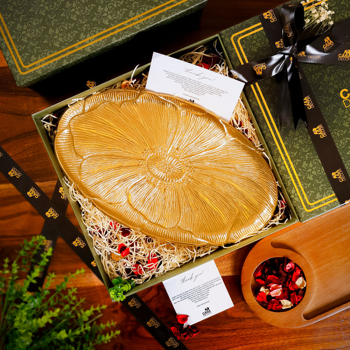 Box Contains: 1 Golden Floral Serving Tray, & 1 Premium Gift Box.