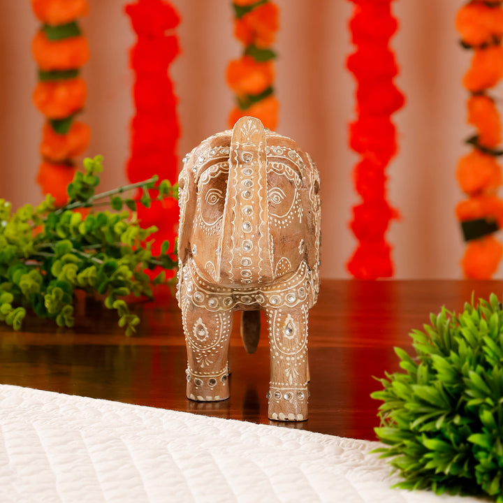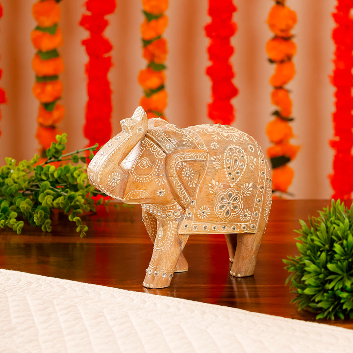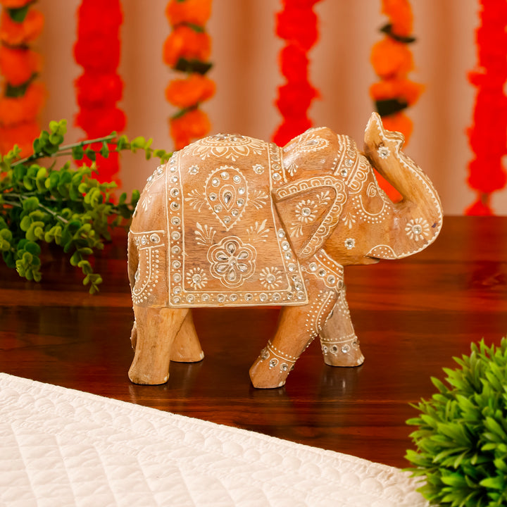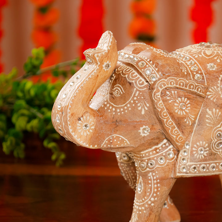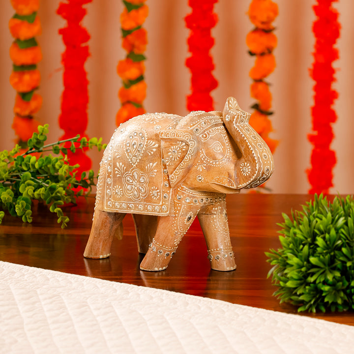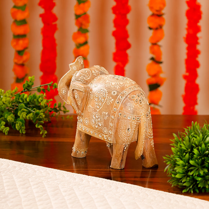 Embrace the elegance of Rajasthani heritage with this exquisite wooden piece. Intricate carvings, weathered texture, and a raised-trunk elephant symbolize luck and craftsmanship. A cultural gem for your space.