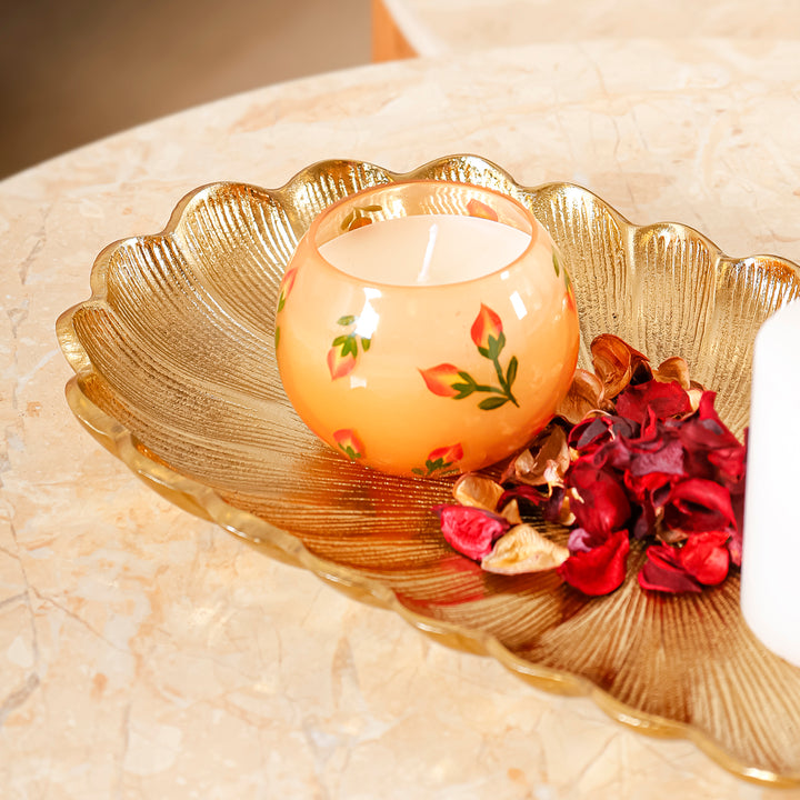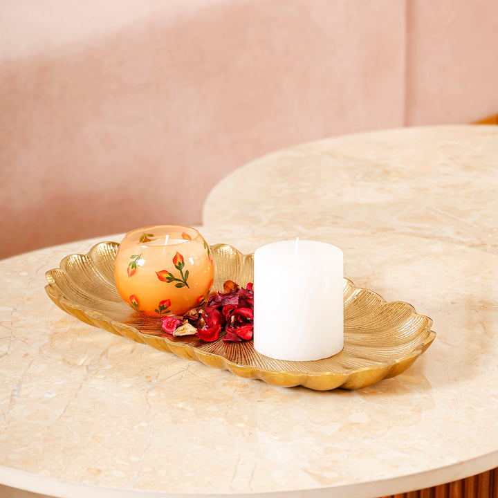 Inspired by natural leaf patterns, this gold scalloped-edge tray brings a luxurious touch to your home décor. Perfect for displaying candles, potpourri, jewelry, or festive accents, it blends elegance with functionality. Its textured metallic finish adds depth and charm, making it an ideal statement piece for center tables, consoles, dining tables, and gifting.