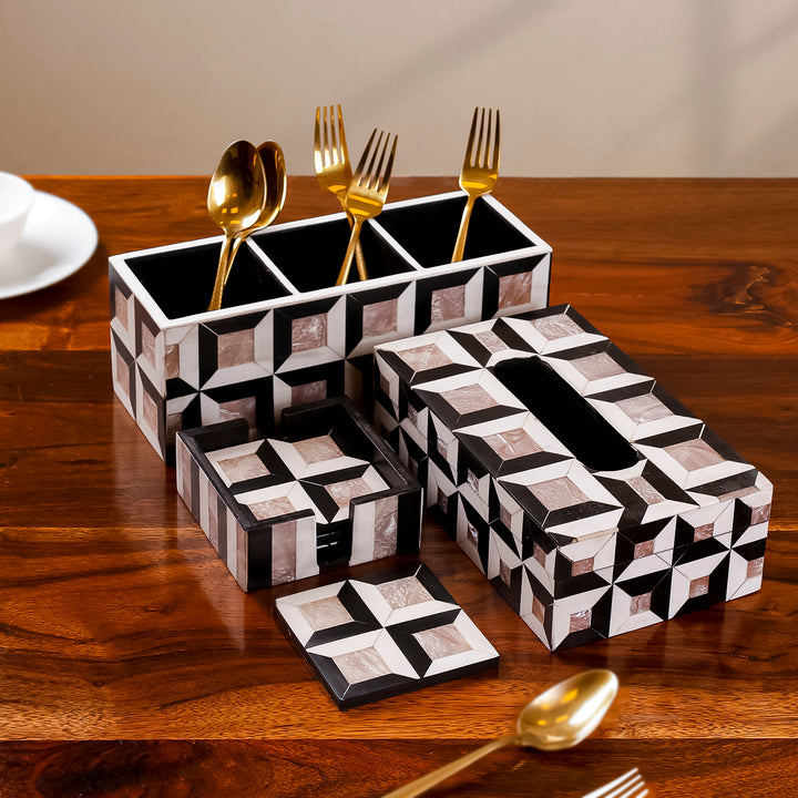 Upgrade your dining space with Casa Decor’s Resin & MDF Table Organizer Set. This elegant combo includes a stylish caddy, tissue box, and 4 coasters with a holder. Perfect for Diwali gifting and home decor, it adds utility, durability, and a premium handcrafted touch.