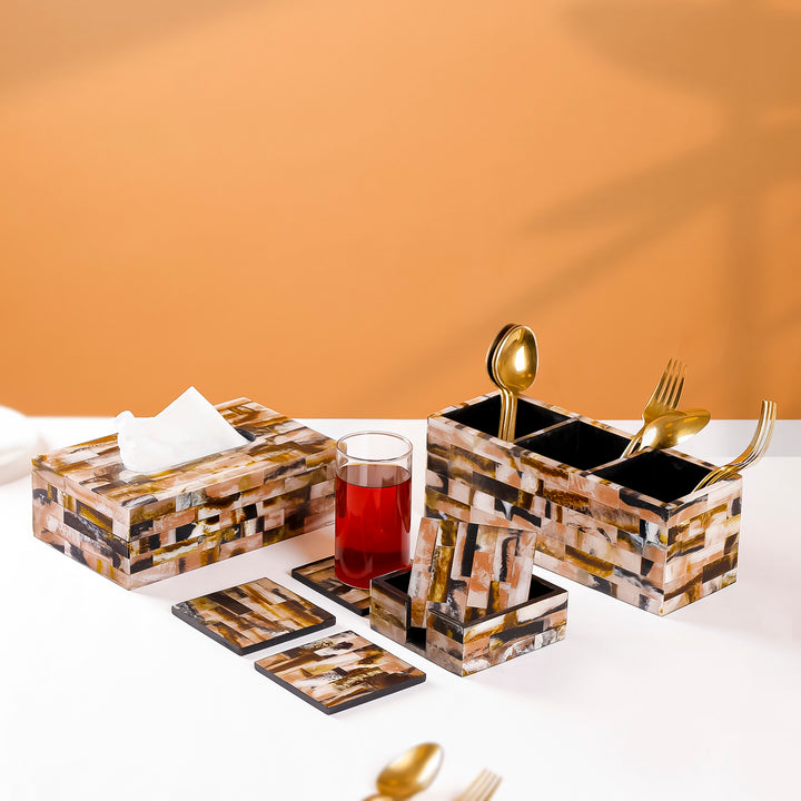 Upgrade your dining space with Casa Decor’s Resin & MDF Table Organizer Set. This elegant combo includes a stylish caddy, tissue box, and 4 coasters with a holder. Perfect for Diwali gifting and home decor, it adds utility, durability, and a premium handcrafted touch.