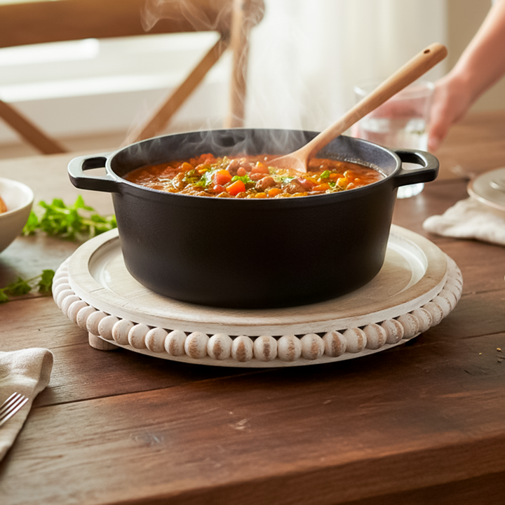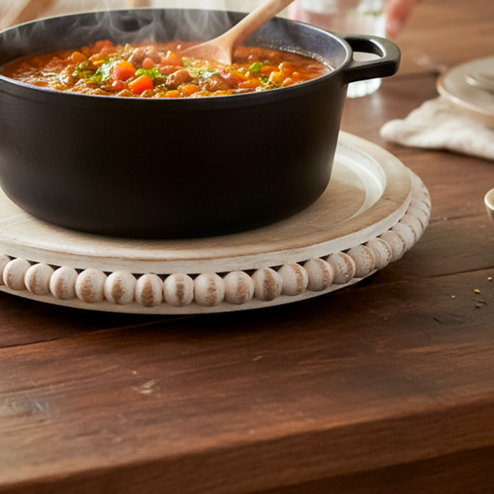 Now add a rustic touch to your kitchen counters and tables with this sturdy wooden trivet. The designer trivet features a spacious round shape for holding different types of platters, plates, and pans on your tables that prevent the hot servings from damaging the finish of your furniture. Perfect for daily use, this piece will extend the life of your premium furniture and countertops.